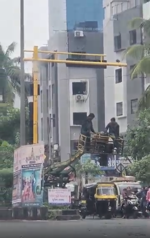 🚫 Municipal worker on busy road circle — working at height without harness.