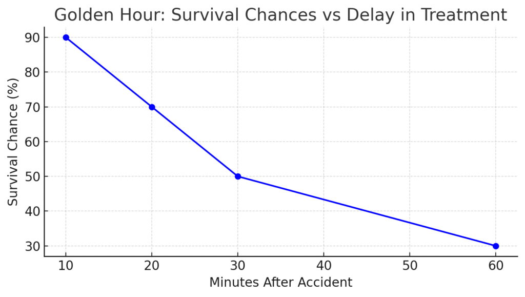 If treatment starts within 10 minutes of a road accident, survival chances are 90%. After 1 hour, survival falls below 30%.